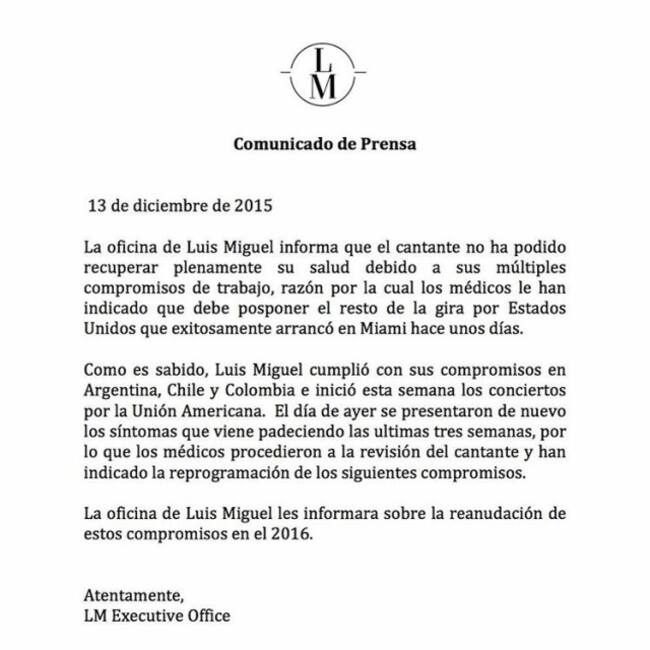Mira el comunicado de prensa oficial sobre la salud de Luis Miguel aquí.