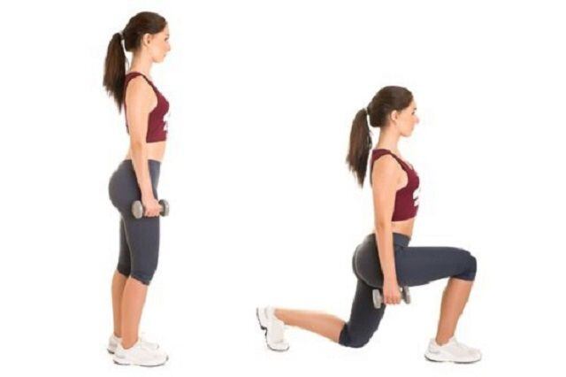 De pie, con independiente y paralela a los pies de la cadera. Da un paso hacia adelante, bajando lentamente tu cuerpo y dobla las rodillas.