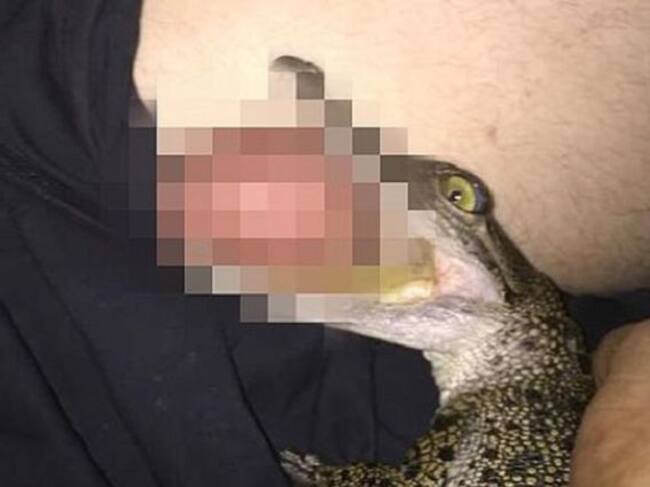 Este pequeño reptil hizo de los testículos de este hombre un dulce bocadillo. En la imagen se aprecia a un pequeño cocodrilo de agua salada disfrutar de los testículos de este hombre, como si fueran un sabroso bocadillo.