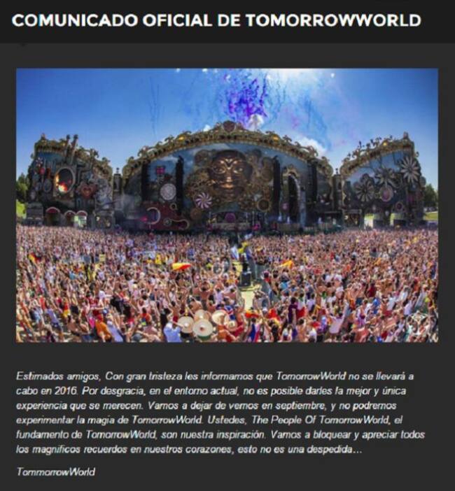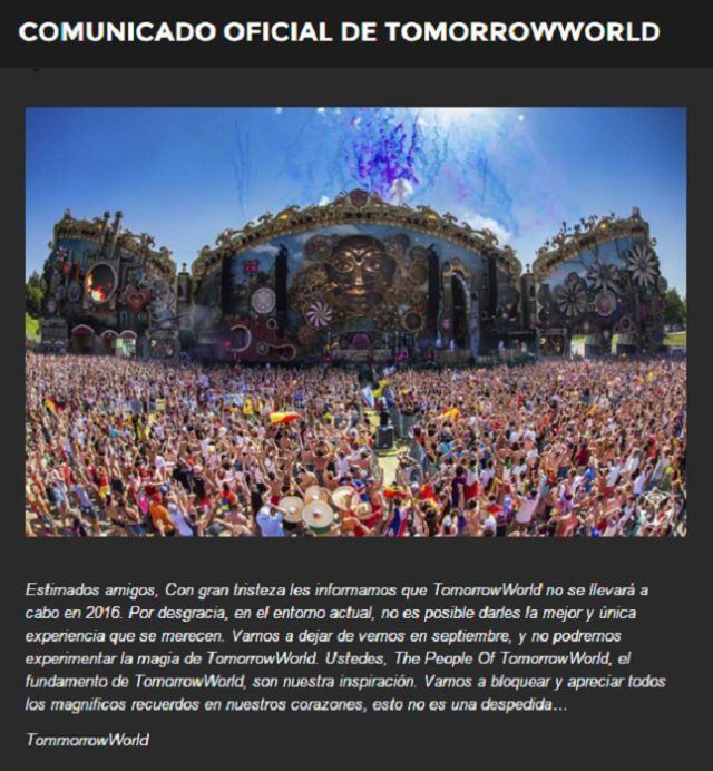 Triste noticia para los amantes de la electrónica en EEUU y es que la versión americana de Tomorrowland, es decir, TomorrowWorld, ha anunciado de manera oficial su cancelación para 2016. El difícil momento por que atraviesa su matriz, SFX, parece haberse cobrado la primera víctima. La organización ha cancelado el festival a través de un comunicado con estas palabras: