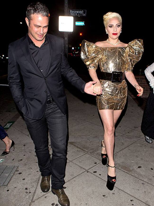 La diva del pop llegó con un mini vestido muy a su extravagante estilo color dorado, acompañada de su prometido Taylor Kinney.