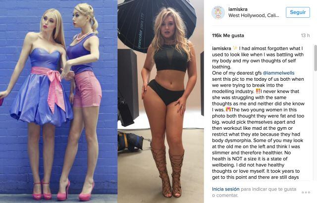 Entrenábamos como locas en el gimnasio y dejábamos de comer porque sentíamos que nuestro cuerpo era deforme. Algunos de ustedes podrán pensar que mi antigua yo, la de la izquierda, era más delgada y por lo tanto más saludable. Pero la salud no es un tamaño, es un estado de bienestar. No tenía pensamientos saludables ni de amor a mí misma […] Todos esos años no cupe en la ropa y me decían que no lograría llegar a ser modelo.