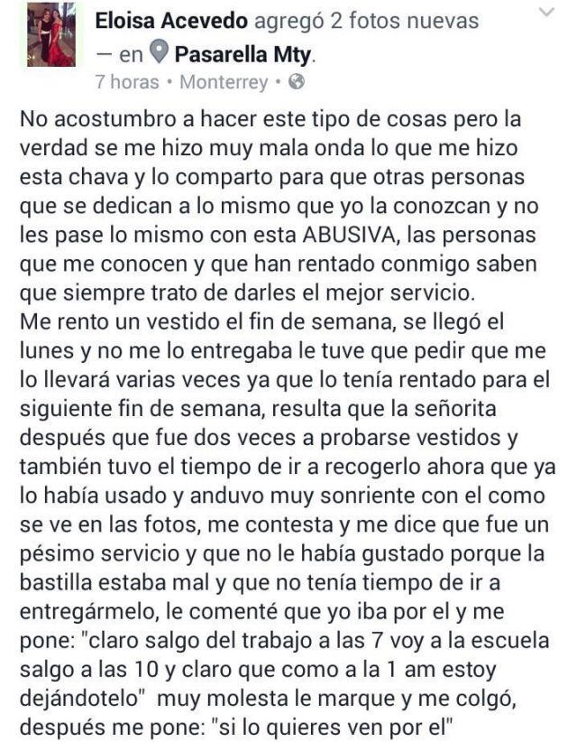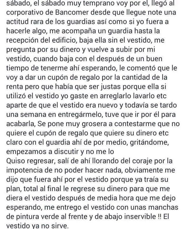 Por lo que la dueña del negocio busco en repetidas ocasionas para que le regresara el vestido que había rentado. Trato de llamarla en más de una vez pero ella no contesto. Hasta que después de varios intentos la roba vestidos le regreso lo que le pertenecía.