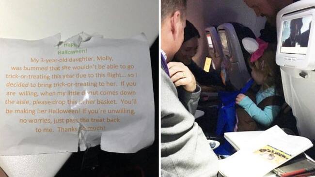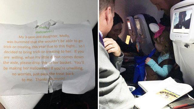 Sin que su hija se diera cuenta hizo un plan, durante el vuelo acudió a los asientos de cada uno de los pasajeros y les entregó pequeños paquetes que tenían un mensaje que decía “¡Feliz Halloween! Mi hija de tres años, Molly, estaba muy desilusionada porque no podría hacer ‘trick-or-treat’ este año debido a este viaje… así que decidí traer el ‘trick-or-treat’ a ella. Si estás dispuesto, cuando mi pequeña dona [en referencia al disfraz de la niña] camine por el pasillo, por favor coloca esto en su cesta. ¡Le harás el Halloween! Si no quieres participar no te preocupes, solo regrésame el paquete. ¡Muchas gracias!”.