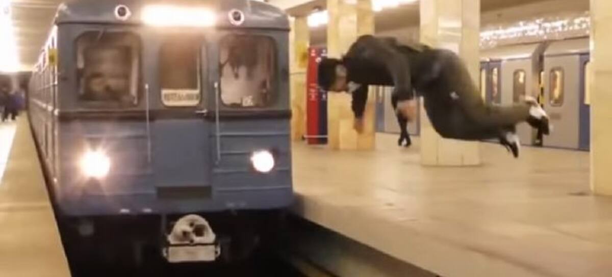 Un joven decidió cruzar las vías del metro con un estilo muy arriesgado. Saltó de lado a lado con una marometa, justo cuando la rápida unidad viajaba a unos metros de él.