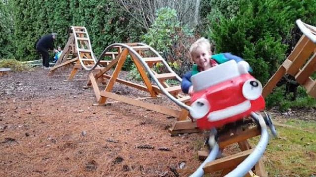 Gregg subió a redes sociales en el que podemos ver a 2 de sus 6 nietos jugando en una mini montaña rusa que hizo, hecha de madera y metal.