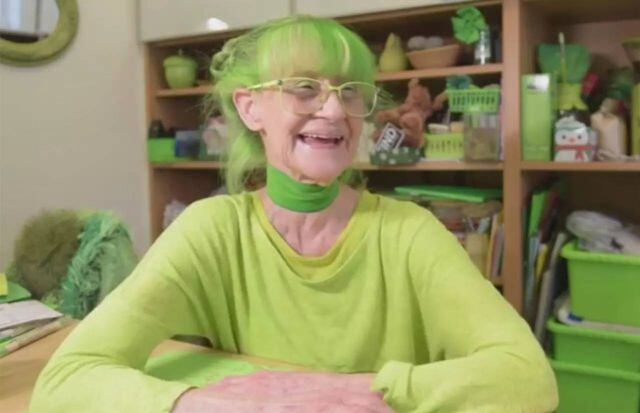"Es el color más positivo en todo el mundo", dice Elizabeth. "Me hace sentir feliz. Puedo despertar realmente miserable en la mañana, y luego vestirme de verde y todo se vuelve maravilloso". Pero eso no es su única motivación para vestirse de verde exclusivamente. La artista de 75 años de edad, también lo hace porque hace feliz a la gente.