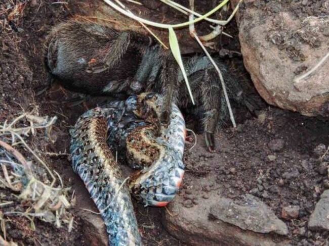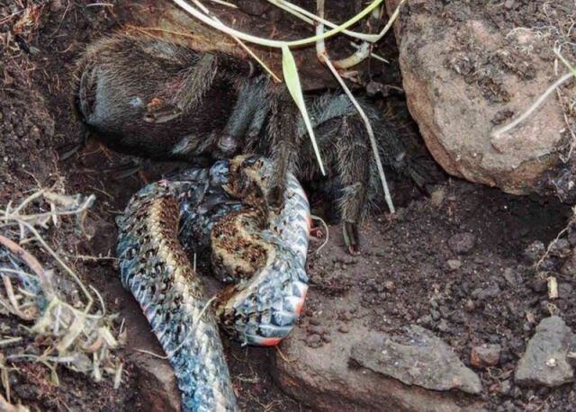 Los Miembros de la Universidad Federal de Santa María, en Rio Grande del Sur, se toparon con una escena nunca vista en el mundo animal: Una tarántula devorando una serpiente de casi 40 centímetros en la naturaleza.
