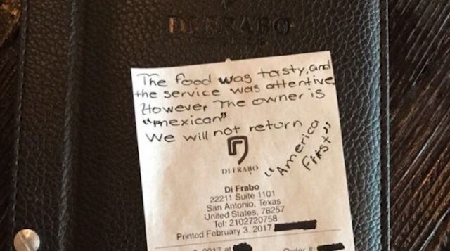 En días pasados se hizo viral un mensaje que dos estadounidenses dejaron en un restaurante al enterarse que el dueño es mexicano "La comida fue deliciosa y el servicio fue atento. Sin embargo, el propietario es mexicano. No volveremos. 'América primero'", como podemos ver hay un alto grado de discriminación.