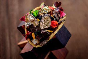 La tradicional tortilla de maíz, que señala la carta es 'infundida' en copos de oro. El relleno es de carne de res de Kobe, langosta, caviar y queso brie de trufas negras; el manjar de dioses se acompaña de una salsa de diferentes chiles, tequila premium y café de civeta.