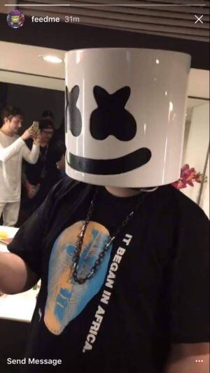 A través de la cuenta de Instagram de "Feed Me" hace días fue publicada una fotografía en donde podemos observar por el reflejo del espejo a una persona qué está tomando la foto, sorprendentemente es el mismo Marshmello pero con el rostro descubierto.