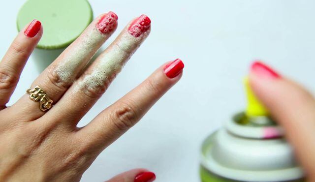 No tires las latas de spray para el cabello o desodorante. El residuo puede ayudarte a secar las uñas. Solo espera 2 minutos después de aplicar y aplica el spray sobre tus uñas.