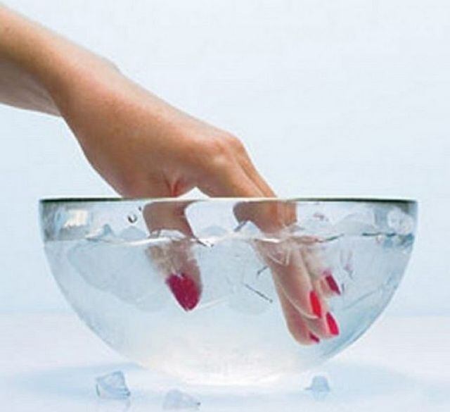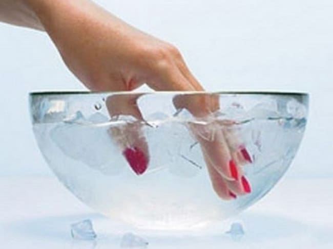 En un recipiente lleno de agua fría, sumerge tus uñas luego de 2 minutos de haberlas pintado. El agua fría ayuda a secar el barniz y después de otros tres minutos, quedarán totalmente secas.
