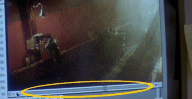 Aquí tenemos una escena de la película de Spielberg en la que.se encuentran en una sala de observación de seguridad del parque, mirando una pantalla que muestra en directo lo que estaba pasando en otro lugar. Pero lo extraño de todo esto es que aparece una barra de reproducción, como la de los vídeos ya grabados.
