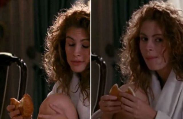 Todos recordamos la mítica comedia romántica que protagonizaron Julia Roberts y Richard Gere, tan repetida en televisión. Lo cierto es que existe un fallo de peso en una de las escenas. La chica se encuentra tomando un delicioso croissant por la mañana, pero de buenas a primeras se transforma en una tortita.