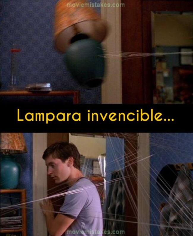 Esta película fue la primera superproducción en la que se llevó a este arácnido superhéroe, la cual cosechó los elogios de la crítica. Su ritmo era trepidante, con lo que es normal que algo se les pasara por alto. Este es el momento en el que Peter acaba de descubrir sus poderes, y comienza a probarlos en su habitación. Entonces impacta con una lámpara que saca del cuarto bruscamente, pero en la siguiente toma vuelve a aparecer sin ningún rasguño y quieta.