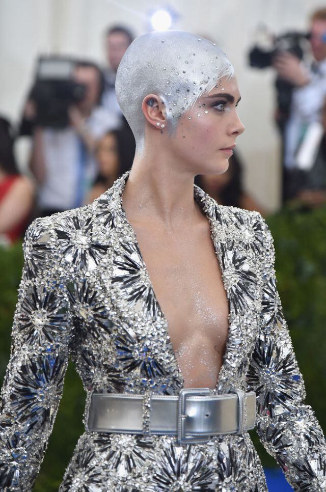 Recientemente Cara Delevingne nos había sorprendido con un radical cambio de look que tenía que hacerse para una nueva película que está filmando. Sin embargo, la verdadera sorpresa nos la dio en la Gala del MET donde se mostró totalmente rapada y con maquillaje plateado en su cabeza para simular un peinado futurista.