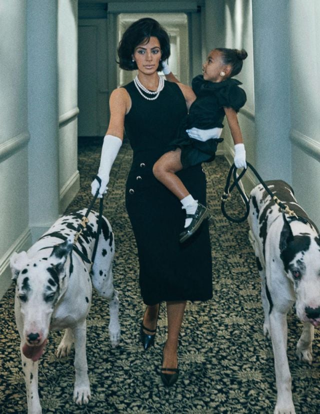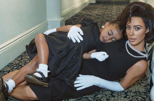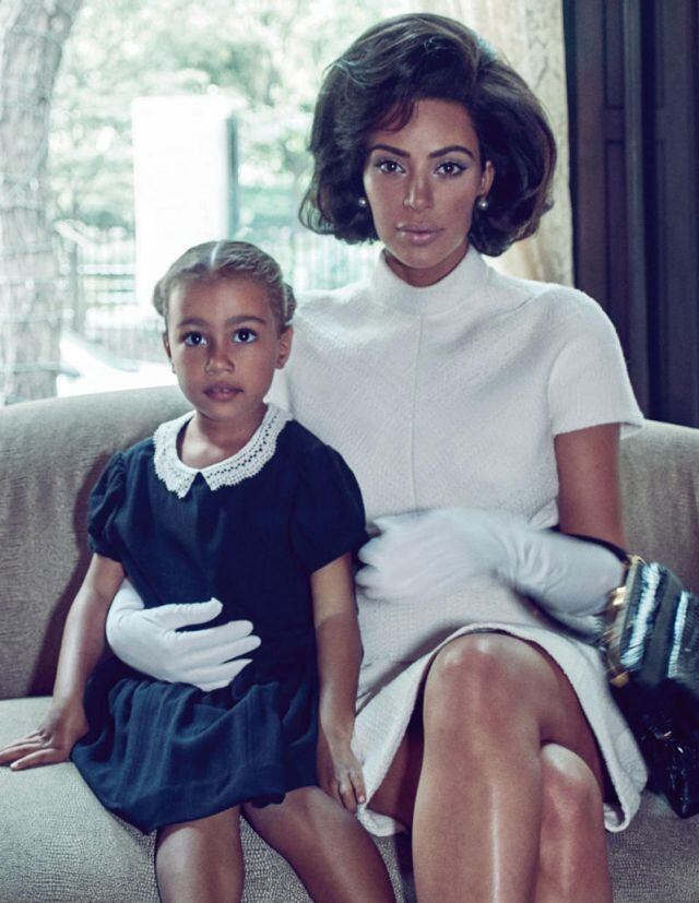 Esta es la primera vez que North West, la hija de Kim y Kanye West, modela para una revista; la niña vistió un vestido negro y guantes blancos como si se tratara de una versión mini de Jackie Kennedy.