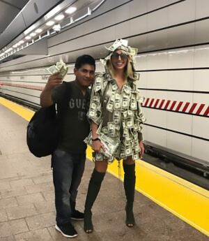 En el metro de la ciudad de Nueva York, la modelo argentina decidió ir por las calles y el metro de esa ciudad luciendo un maravilloso vestido de dólares, así es el vestido estaba hecho de billetes que cubrían su cuerpo.