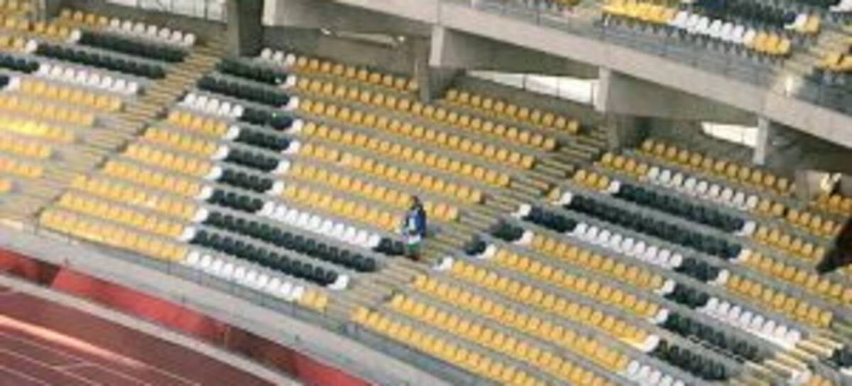 Era el único punto verde y azul en medio de una tribuna repleta de sillas vacías.