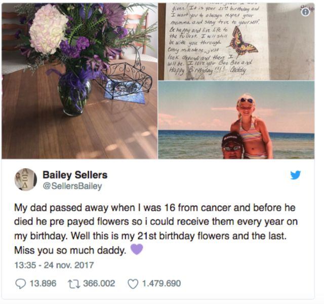 Michael William Sellers falleció en 2012 a los 56 años. Decidió mantener la tradición de darle flores a su hija hasta que cumpliera los 21, este año es el último. Ahora que ya llegó a su casa de Tennessee el último ramo de flores, Bailey Sellers, la hija, muestra en redes la tarjeta personalizada y escrita a mano, además de una foto de infancia junto a su padre.