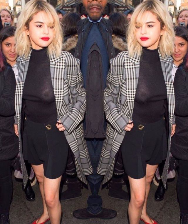 Durante su última aparición en público en Londres, Selena Gomez lució una blusa negra y un abrigo de cuadros gris. Pero no sabemos si fue intencional o el flash de las fotografías que la intérprete de "Wolves" dejó ver de más con su outfit.