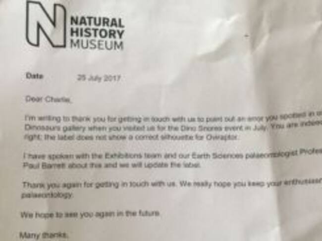 Días más tarde, el museo envió una carta a casa de Charlie reconociendo que el niño tenía razón y que estaban "verdaderamente impresionados", agradeciendo sus conocimientos sobre paleontología.
