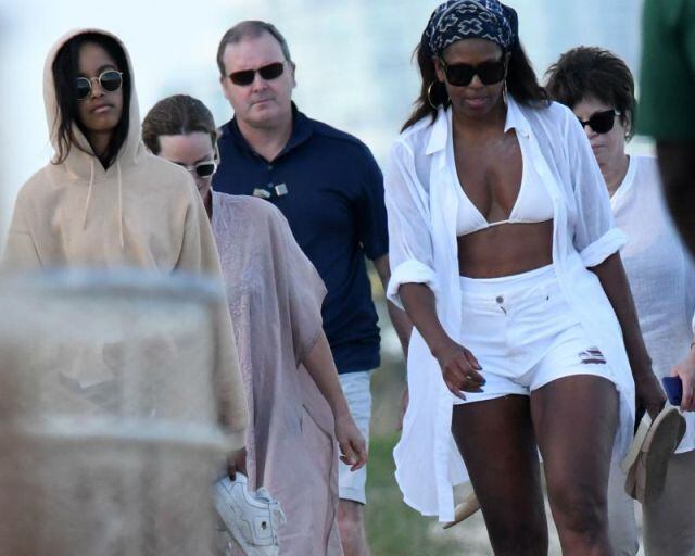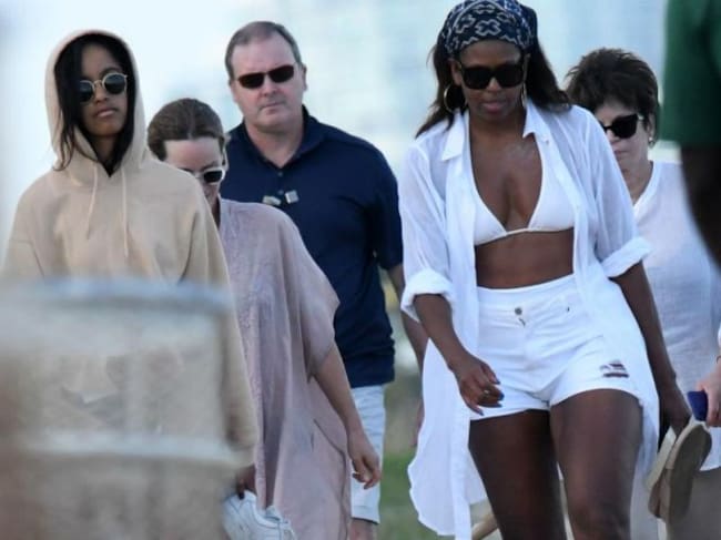 Su hija Malia, de 19 años, también se encontraba ahí y decidió usar una sudadera con capucha, cubriendo su traje de baño, mientras caminaba por la playa junto con su mamá.