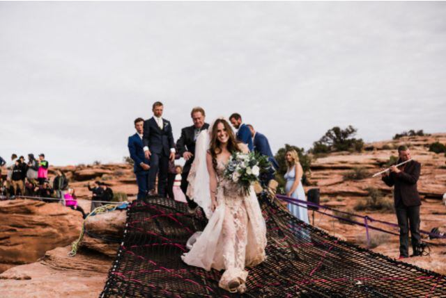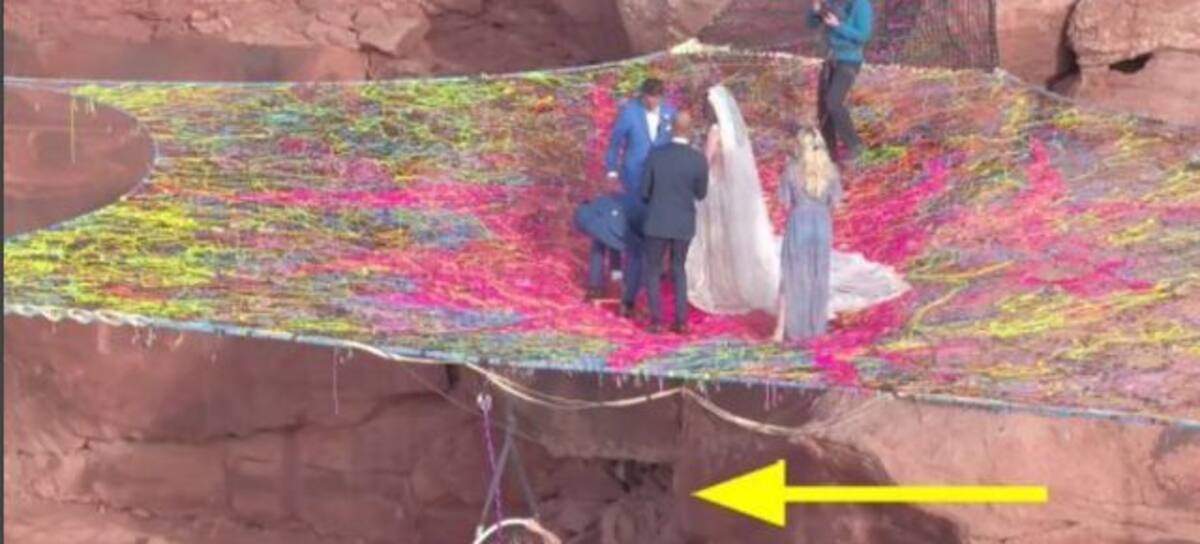 La ceremonia no fue nada normal, pues se llevó a cabo a 120 metros de altura, por lo que armaron una telaraña gigante, donde montaron el altar y por supuesto, los invitados fueron limitados.