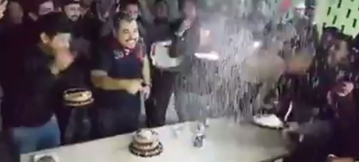 Este video ha dado la vuelta en las redes sociales y se ha vuelto viral ya que un chico en su cumpleaños está a punto de morderle al pastel cuando todos los que se encuentran en la fiesta lo avientan y empiezan embarrarlo de pastel. Después le echan cerveza y otros objetos hasta tirar la mesa en donde se encuentra.