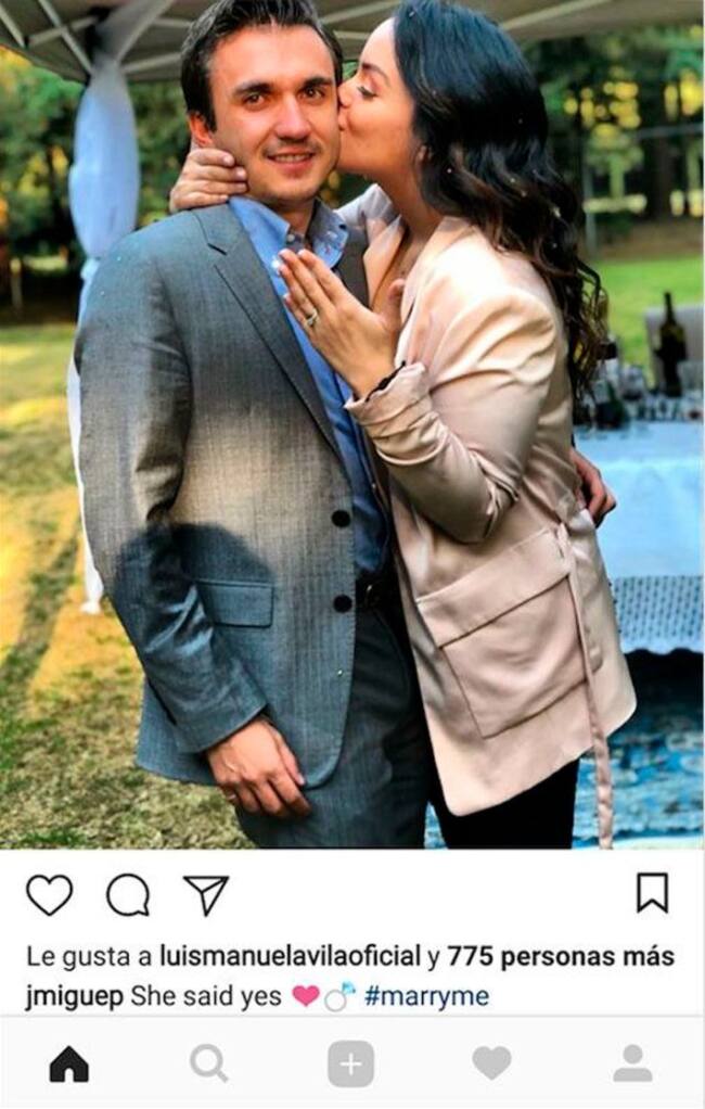 "She Said Yes" dice la foto donde su novia, Monch Ocampo, besa en la mejilla al actor y enseña su anillo de compromiso.