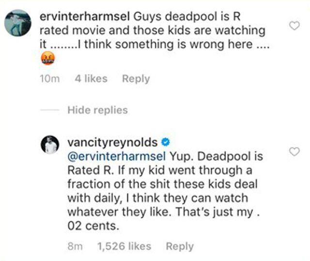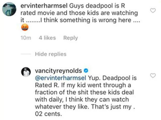 Sin embargo, ni todas las buenas causas provocaron que Ryan Reynolds no fuera criticado por uno de sus fans quien escribió: "Chicos, esta película es clasificación R y estos niños la están viendo, creo que hay algo mal aquí".