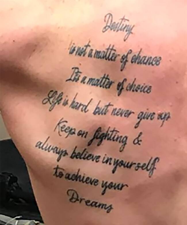 "Destiny is not a matter of change. It's a matter of choice life is hard but never give up. Keep of fighting & always believe in yourself to achieve your dreams (El destino no es una cuestión de cambio. Es una cuestión de elección, la vida es difícil, pero nunca te rindas. Sigue luchando y siempre cree en ti mismo para lograr tus sueños)", escribió en su piel el famoso boxeador mostrando su torso de lado izquierdo.