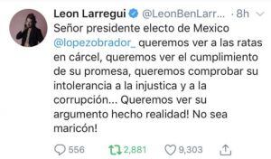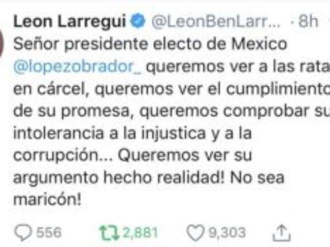 León Larregui ofreció disculpas en Twitter por llamar "maricón" al presidente electo, Andrés Manuel López Obrador, al exigirle que cumpla sus promesas de campaña.