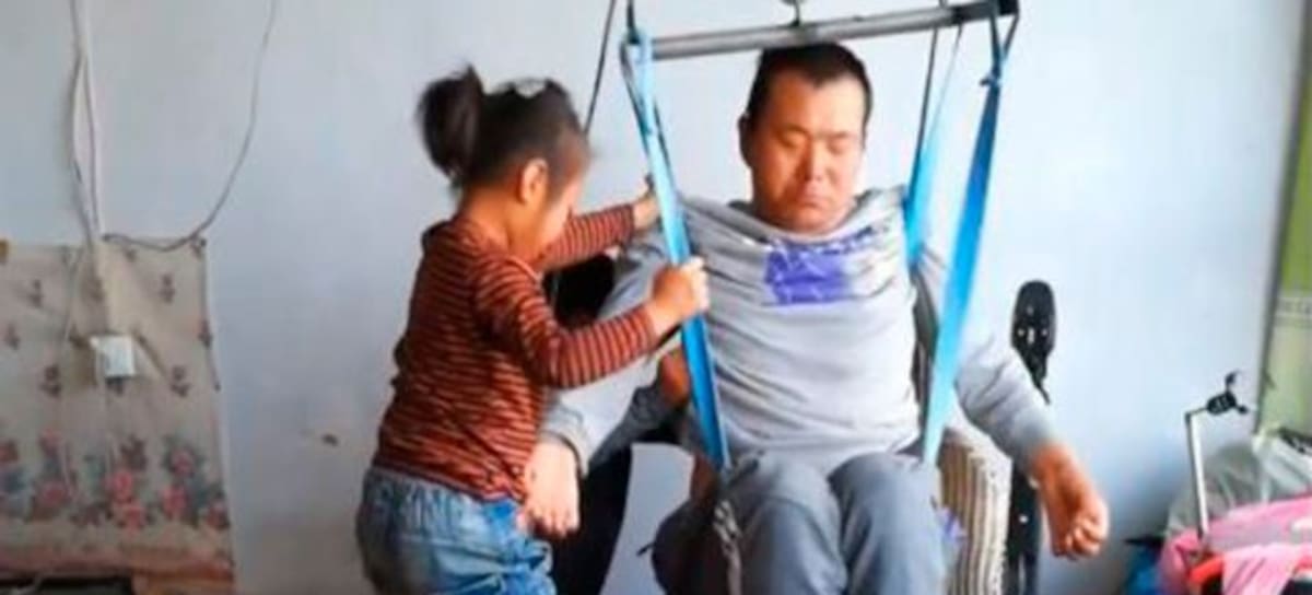 La niña originaria de China le da masajes, lo alimenta y lo ayuda a moverse luego de que su madre los abandonara 2 meses después del accidente de su padre que lo dejó inmovilizado.