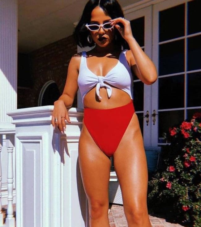 En la imagen se ve a la intérprete de ‘Mayores’ luciendo un traje de baño con un top en color blanco y el bikini de corte alto, color rojo. Sus respectivas gafas de sol no pudieron faltar, así como sus labios pintados en un tono oscuro.