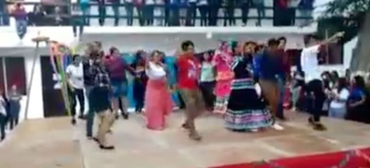 Alumnos y maestros querían ser parte de la coreografía de la ya famosa canción "Payaso de rodeo" de Caballo Dorado, pero nunca imaginaron que todo terminaría siendo un pequeño accidente.