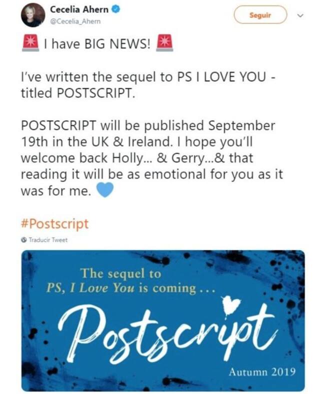 La autora Cecelia Ahern anunció la secuela de su libro Posdata: Te amo, y podrás leerla antes de lo que piensas, confirmó la noticia en Twitter, compartiendo el título de su nuevo libro y la fecha de lanzamiento: