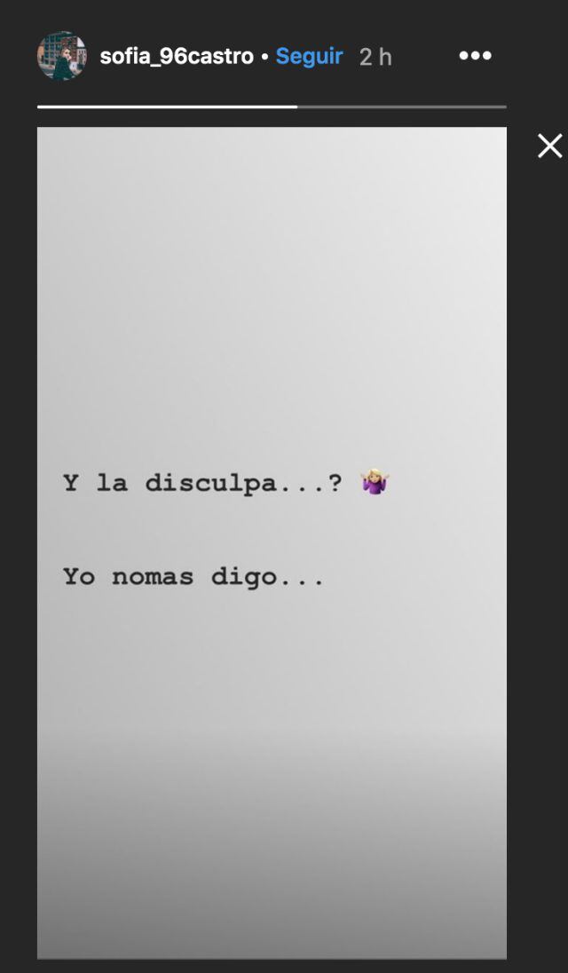 En su cuenta de Instagram, la actriz de 22 años publicó un texto que dice "¿y la disculpa para cuándo? yo nomás digo". Aunque el mensaje no tenía el nombre de a quién iba dirigido, se sospecha que era para EPN pues Sofía Castro lo publicó tan solo dos horas después del mensaje que publicó el ex presidente.