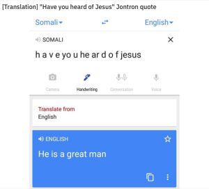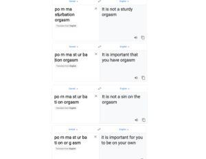Después, un internauta escribió: ‘porno, masturbación y orgasmos’, al traducirlo del somalí al inglés con ciertos espacios: En el primer ejemplo dice “Eso no fue un vigoroso orgasmo”, en el segundo, “Es importante que tengas un orgasmo”, en el tercero “Eso no es un pecado en el orgasmo” y finalmente “es importante que te mantengas en forma”.