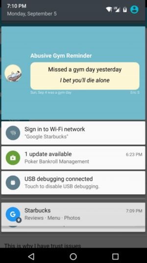La pregunta aquí no es si necesitas esta app, la pregunta sería ¿La aguantarías, ¿Por qué? la respuesta es sencilla, esta amable app te recuerda que debes ir al GYM con mensajes groseros, como: