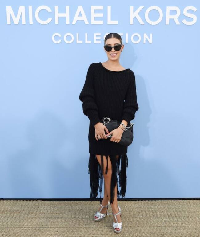 Otra invitada mexicana fue Michelle Salas, quien se decidió por usar un vestido negro estilo suéter con flecos que complementó con sandalias con tacón metálicas.