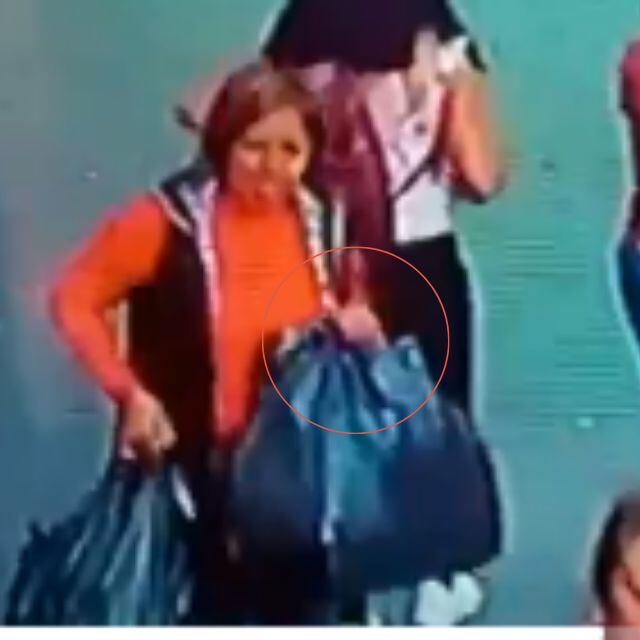 La segunda mujer (chaleco azul y mangas anaranjadas) se aproxima a la puerta del establecimiento vigilando en que momento puede acercarse más y tomar las bolsas que la chica cuidaba