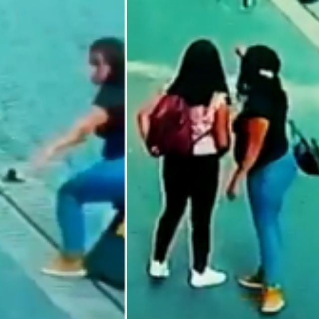 En seguida dos mujeres que caminaban a la par se hacen señas indicando a la próxima víctima y una de ellas (sudadera roja) hábilmente arroja monedas al suelo y se acerca a ella indicándole que se le cayeron, la chica sin saber que pasa ayuda a recogerlas