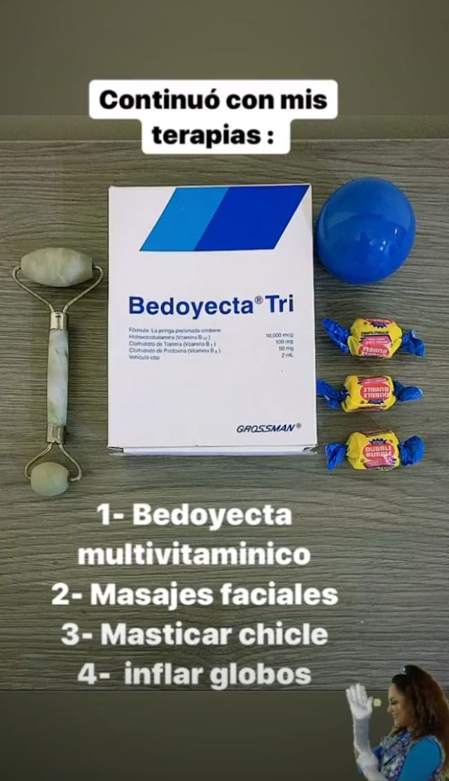Además del agradecimiento que dio a sus fans por apoyarla en este momento de su vida, Tatiana también compartió en Instagram el tratamiento que sigue para recuperarse, el cual incluye medicamentos, un aparato para masaje, gomas de mascar y globos para inflar.