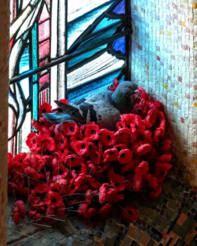 En redes sociales se hizo viral un original nido de amapolas que creó una paloma dentro de un Memorial de Guerra en Australia.