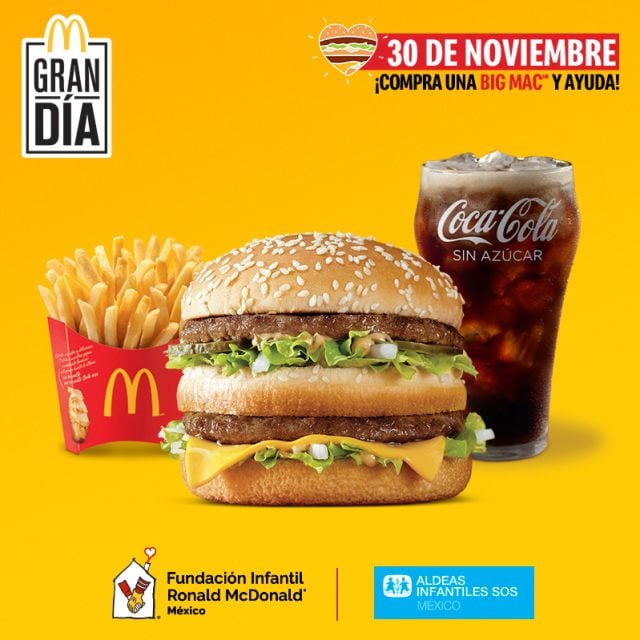 Este 30 de noviembre, McDonald’s destinará parte de las ganancias de la venta de esta emblemática hamburguesa en beneficio de la Fundación Infantil Ronald McDonald y Aldeas Infantiles SOS México. Con esta inicitiva pretende regalar un Gran Día a los amantes de su icónica hamburguesa y contribuir a mejorar la vida de niños, jóvenes y familias.