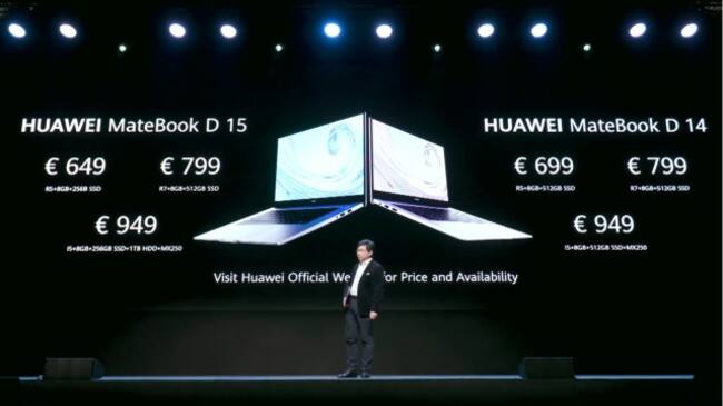 La otra familia de computadoras que integra a la D14 y D15 que tienen hasta 97% del aspecto de la pantalla y que a diferencia de la MateBook X Pro habrá con procesadores Intel y Ryzen con gráficos RX Vega 10. Este lineal tiene el Shark Fin FAN 2.0 que es un ventilador que es capaz de dar hasta un 27% más flujo de aire para mantener el equipo más frio y por ende tener mejor rendimiento. A su vez se integra un lector de huellas dactilares en el botón de encendido y una cámara a la altura del teclado que podemos ocultar a nuestra discreción. Algo de resaltar es que tendrá pre instalado Office 365. Los precios van desde los €649 euros por el sistema con Ryzen 5 con 8 GB de Ram y 256 GB de SSD hasta los €949 con Core i5, 8GB de Ram y 512 GB de SSD con gráficos MX250 de NVIDIA.