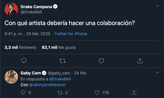 El 24 de Febrero, uno de los cantantes favoritos que nos visita muchas veces, Drake Bell, lanzó una convocatoria en sus redes sociales para que le dijeran con qué artista debería hacer él una colaboración. La publicación tuvo 82 mil likes y 3,3 retweets.