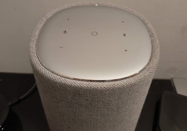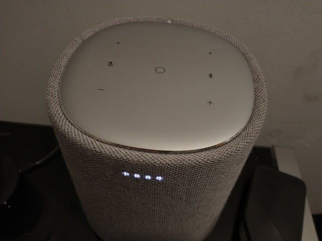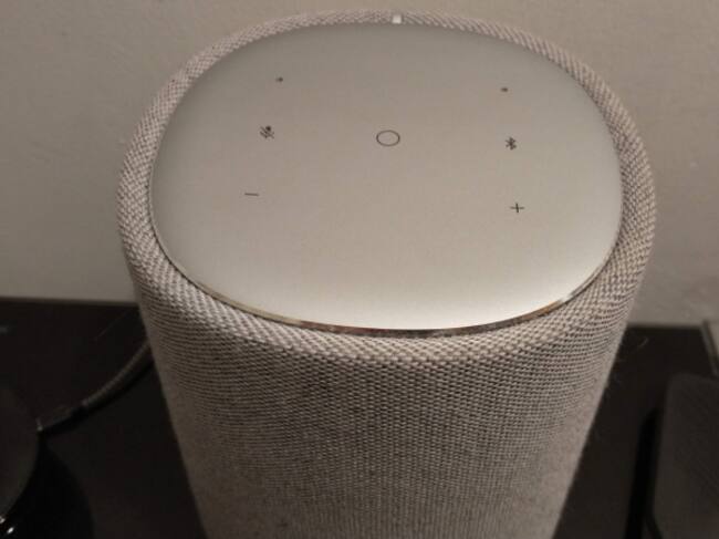 Con acabados sobrios y elegantes, la bocina está rodeada de una cobertura textil gris. Ésta no se ensucia ni guarda polvo en exceso. Su altura es más o menos la misma que la Google Home (la normal, no la mini), por lo que no acapara el espacio en tus repisas. Cuenta con un solo cable de alimentación y botones táctiles en la parte superior, para controlar volumen, avanzar, retroceder, activar o desactivar el micrófono y el bluetooth.